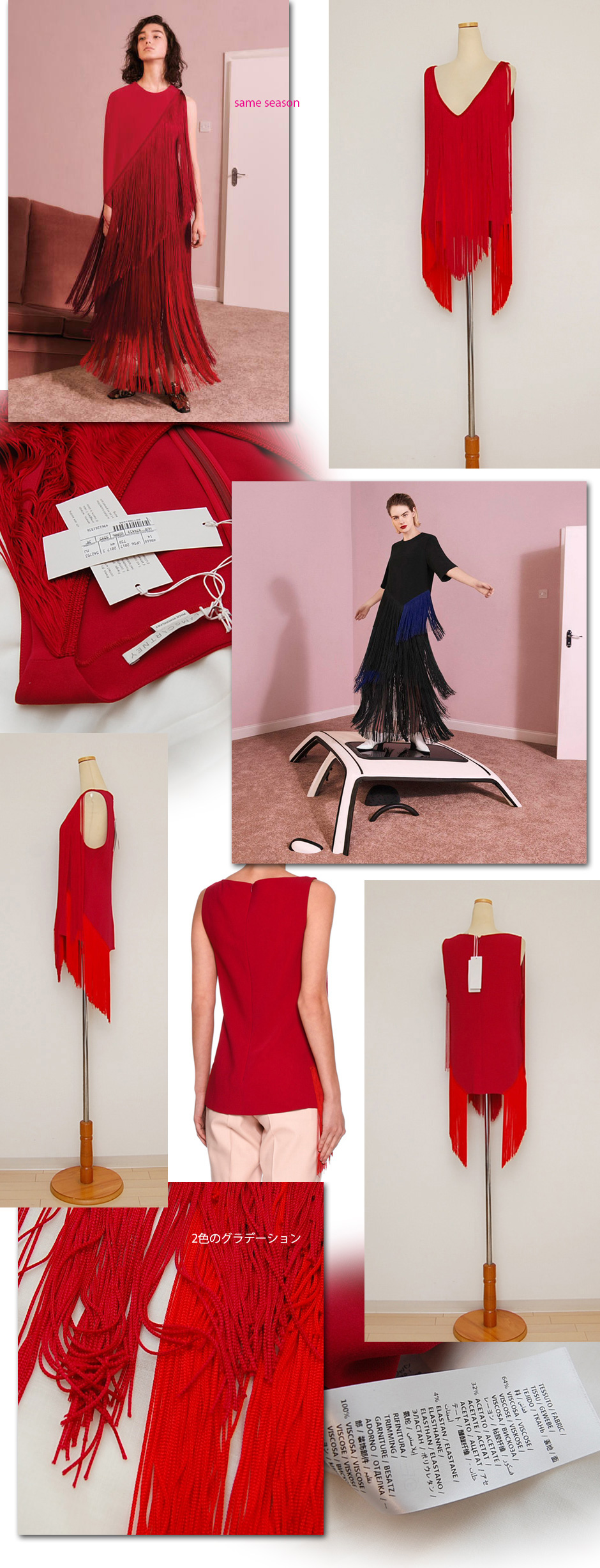 フリンジ部位は長さがランダム&二種類のお色の違うフリンジが使用されており美しいグラデーションを演出してくれます。本体素材はとてもしっかりとした厚手の素材感、バストの開きが大きめですのでインナーにもう一枚Vネックのタンクトップを合わせていただいてもOKです。パンツはもちろん、シンプルなスカートと合わせても可愛いです。
