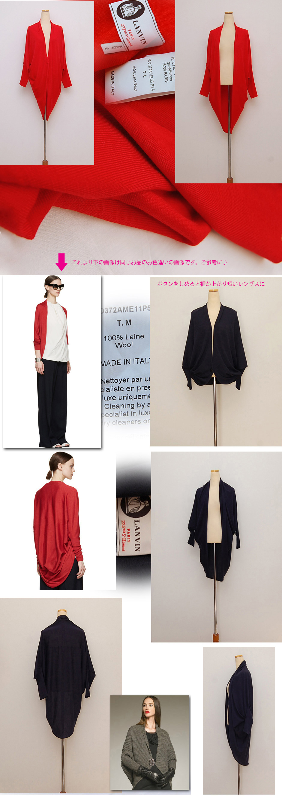 フロントボタン一つ、メリノウールっぽい素材感、バックに綺麗にドレープが入ります。ラインが分かりづらいですが、どなたでも綺麗に着ていただけるデザイン&他ではないおしゃれなラインのカーデですのでとてもオススメ。毛羽立ちもほぼなくかなり綺麗なお品です。