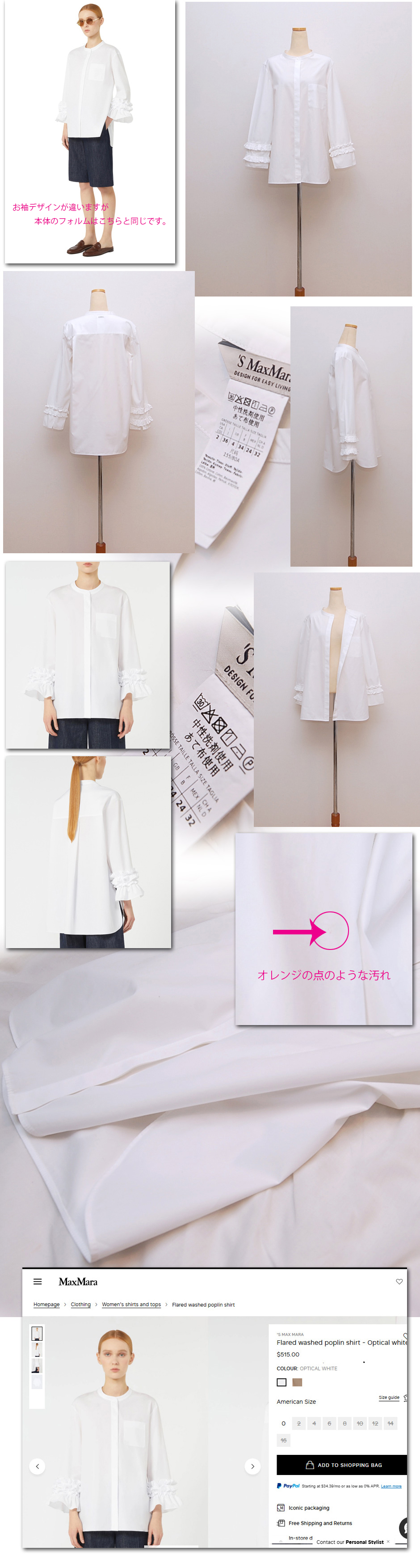 ヒップが隠れるレングス、(バックレングスが少し長め)お袖のフリルは左右でデザインが違うアシンメトリーなデザインです。ご自宅手洗いOK 右袖に点のような小さな汚れあり、こちらはほとんど分からない程度ですがその他シワ感と部分的なヨレがみられます。