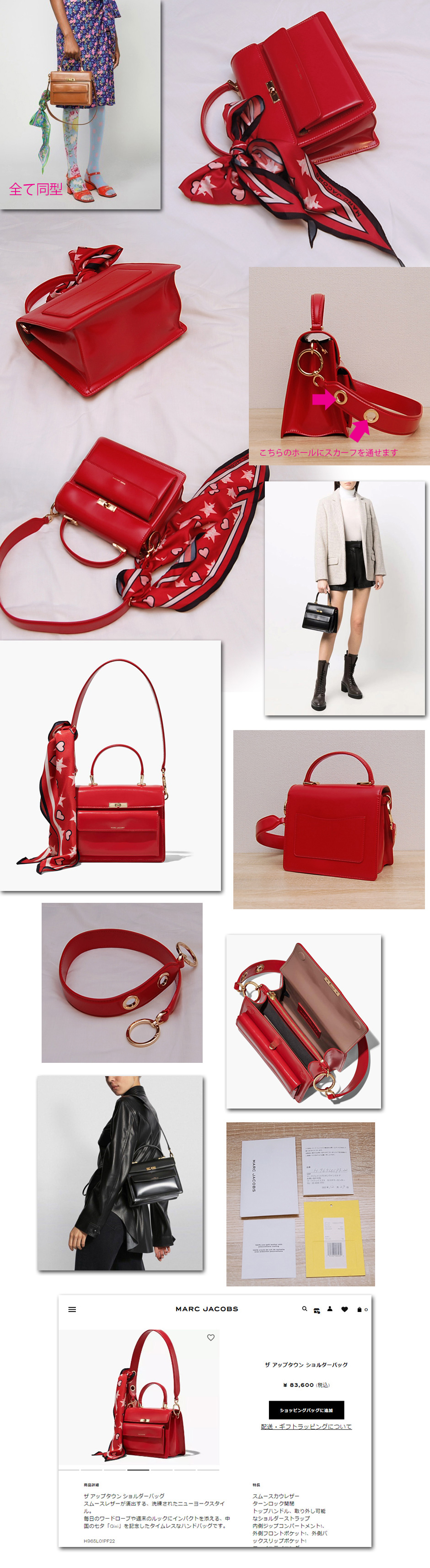 かちっと硬さのある素材感、スカーフ付きでお好きな場所(ハンドルやストラップにデザインされた穴等)につけてご使用できます。ハンドバッグとしても、付属のショルダーを付けてショルダーバッグとしても使用可。高級感のあるスタイリッシュなバッグです。定価:83600円