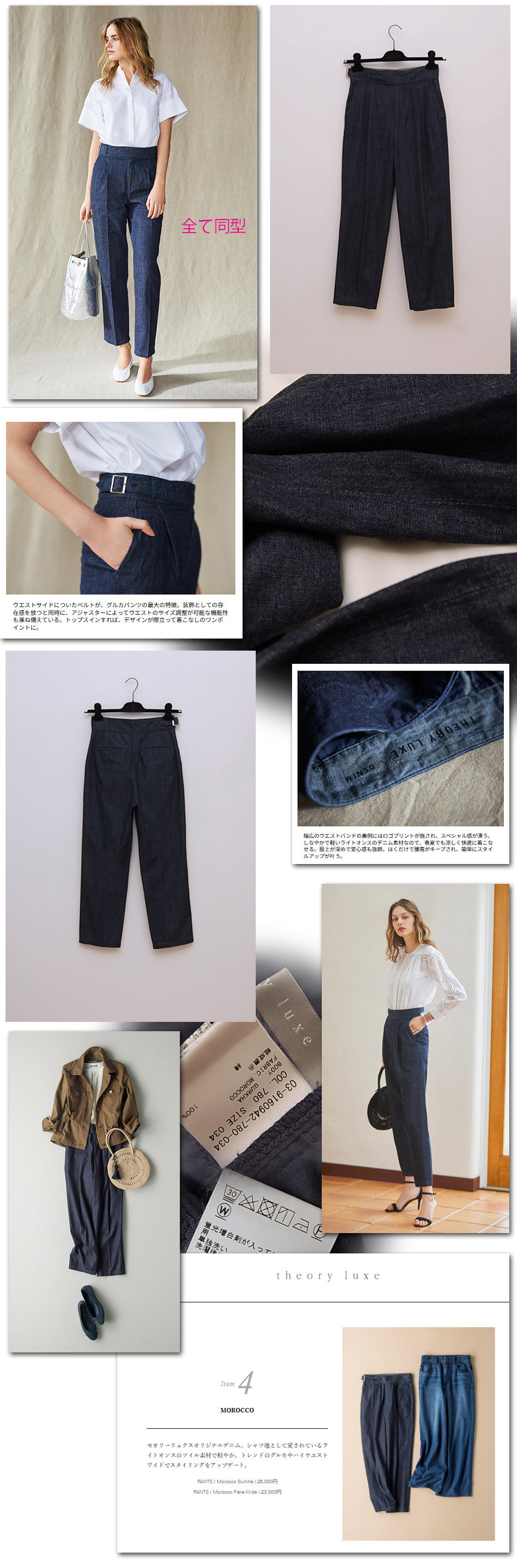 おへそ上数センチほどのハイウエスト型、テーパードですがストレートレッグに近いです。とにかく形が綺麗で特に骨盤近辺(ヒップ幅)が目立たず綺麗に履いていただけます。ウエストはベルトがありますので微調整ができます。一部にシワ感がありますがまだまだ綺麗なお品です。定価:26000円