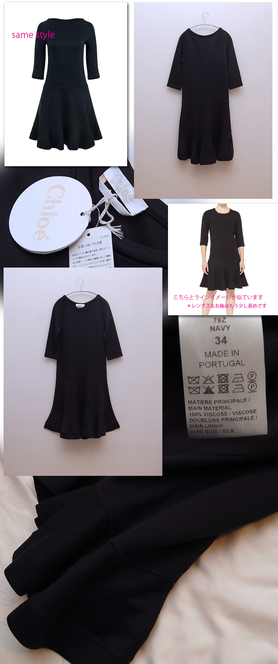 膝にかかるレングス、タイトなサイズ感ですので常に最小サイズを着用される小柄な方or細身の方にオススメです。ネックは広めのラウンド型、お袖は6分程度の長さです。薄い素材ではなく、重厚感のあるしっかりとした軽いストレッチ性のある素材感です。